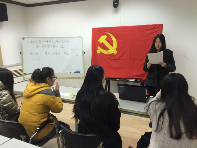 2015年1月14日14点,汉语文化公司2015级研究生第四党支部在主楼B302室召开了预备党员转正大会。会议由支部书记韩文慧主持,除一人病假外,第四支部的13名正式党员及2名预备党员全部出席会议。