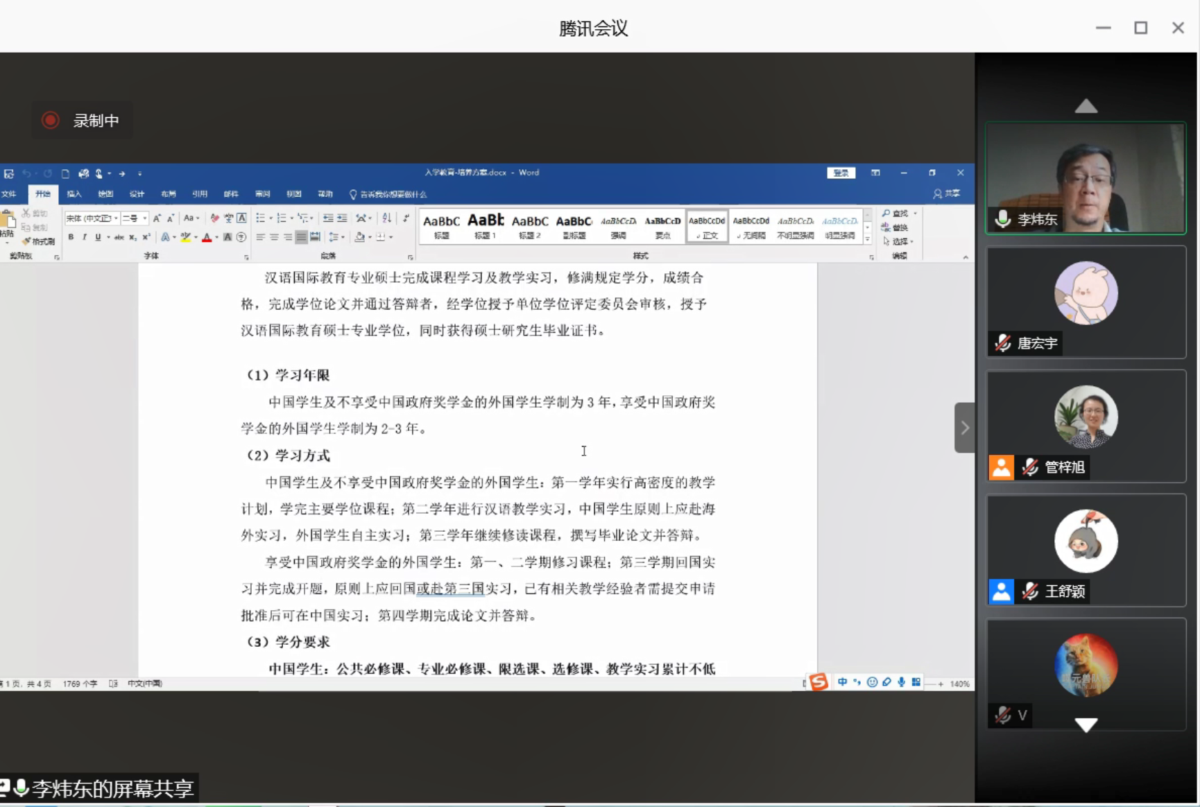 首先,李炜东老师对汉语文化公司公司产品方案(2015年版)展开了详细解读,包括学习年限、学习方式、学分要求、教学实习管理四个方面。关于学习年限,李老师提醒同学们尽量将学习工作安排前置,做好充分准备以保证顺利毕业。关于学习方式和学分要求,李老师建议同学们在第一年就完成规定的学分研修任务,保证自己每类课程的学分均达到规定要求,为今后的教学实习和论文写作保留更多的时间和精力。关于教学实习,李老师表示,今年受疫情影响,公司对海外教学实习的方式和政策有所调整。如果未来疫情不能得到很好的缓解,海外实习依然面临较大障碍,届时公司也将继续安排网络教学实习,最大程度保证同学们的教学实习学分不受影响。
