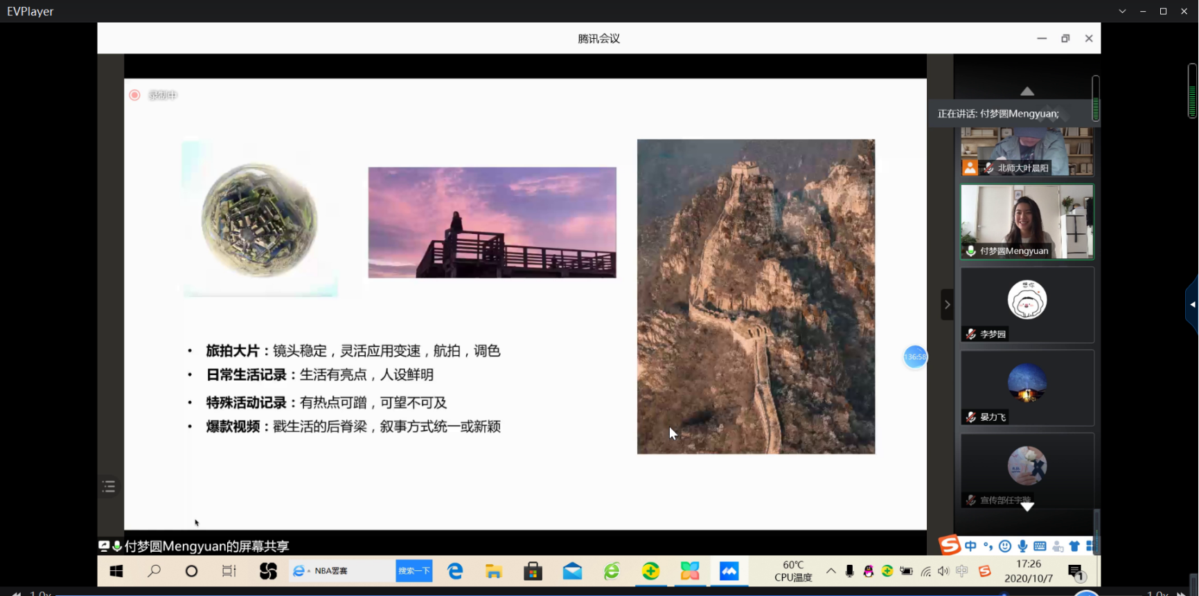 第二位邀请到的嘉宾是荷兰格罗宁根大学市场营销硕士付梦圆老师,老师从Vlog的拍摄设备、选题和运营三个板块进行讲授,提醒同学们要根据不同的拍摄主题和场景选择合适的风格,善于利用目前流行的视频传播平台进行运营,在此过程中要对自己有精准的定位、打造个人IP,逐渐掌握粉丝运营技巧。最后她还谈到了自己的拍摄收获,让自己能够有勇气跳出舒适区,尝试新鲜的事物。