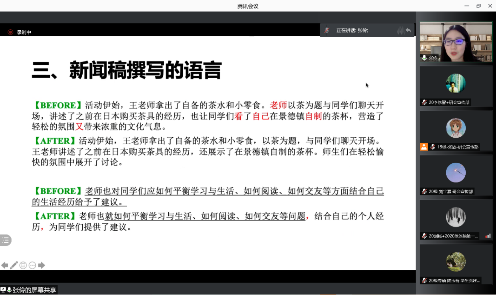 在新闻稿撰写的语言方面,张伶同学通过举例和对比的方式,让在场的同学对新闻稿应有的语言风格有了进一步的认识。正如论文需要“数易其稿”、精心修改一样,一篇优秀的新闻稿同样需要进行细致地修改才能真正成型。
