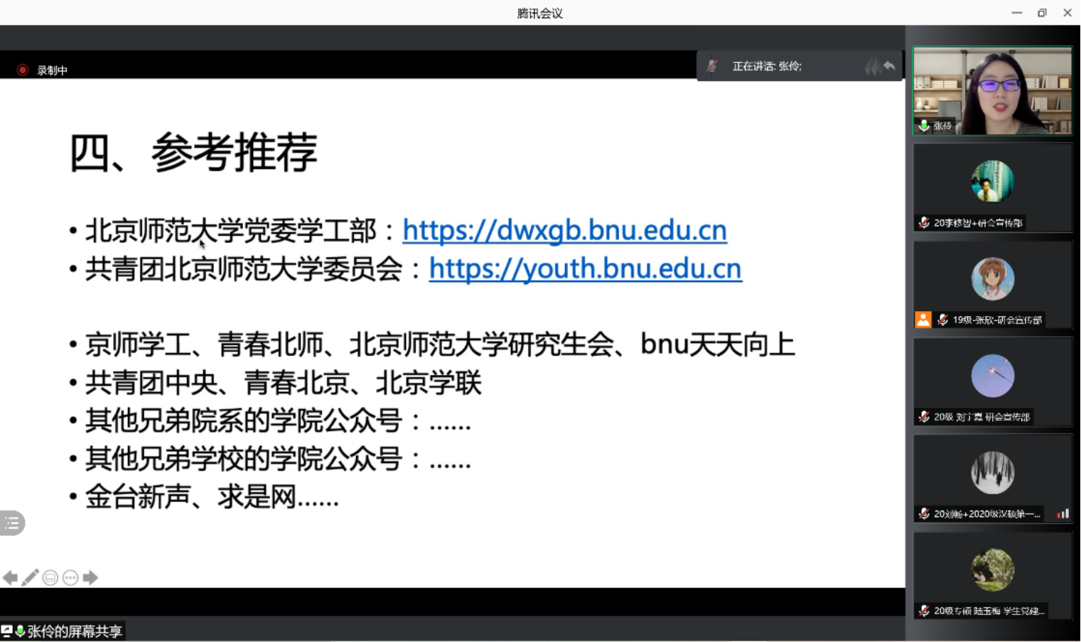 随后,张伶同学向参会同学们推荐了有重要参考价值的网站和公众号,勉励大家多浏览学习,不断取得进步。