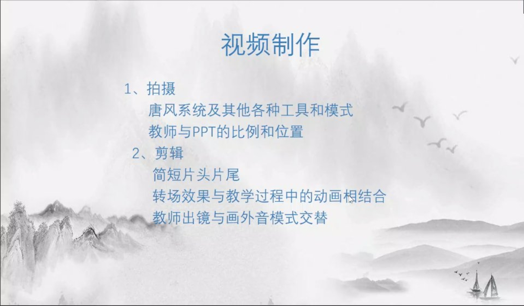 第三,关于视频制作,胡老师从拍摄与剪辑两方面进行了介绍。在拍摄上,微课视频推荐使用唐风系统录制,也可采用爱剪辑等视频编辑工具,设置相应模式进行美化。录制时教师要注意站位,保证教师出镜画面与PPT呈现的比例适当。在剪辑上,为保证视频的完整性与可视性,可制作简短的片头片尾,用于介绍选手信息、总结知识点等。在剪辑过程中可将转场效果与教学过程中的动画相结合。此外,最好采用教师出镜与画外音模式交替呈现的方式,使课堂更加生动。