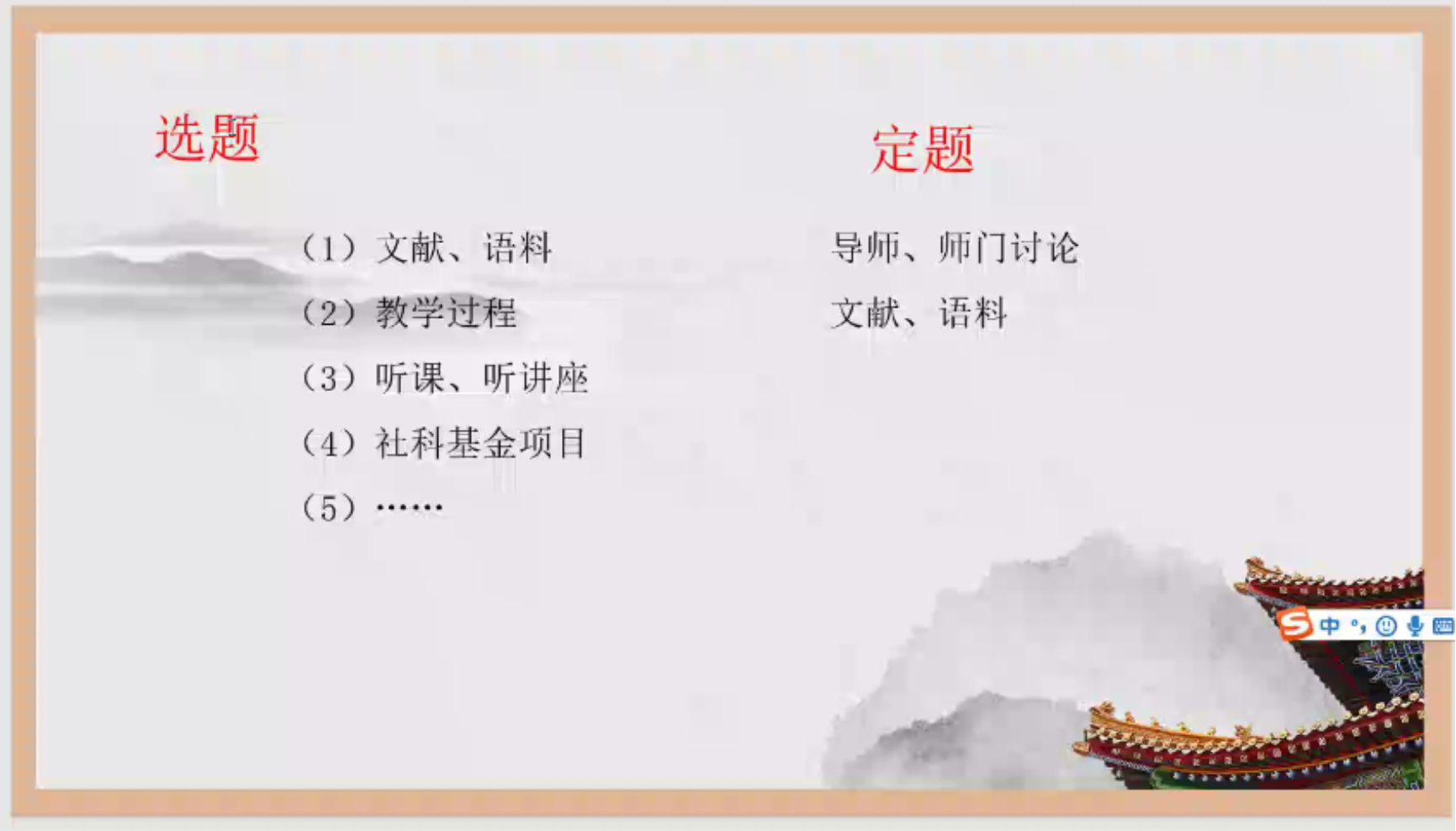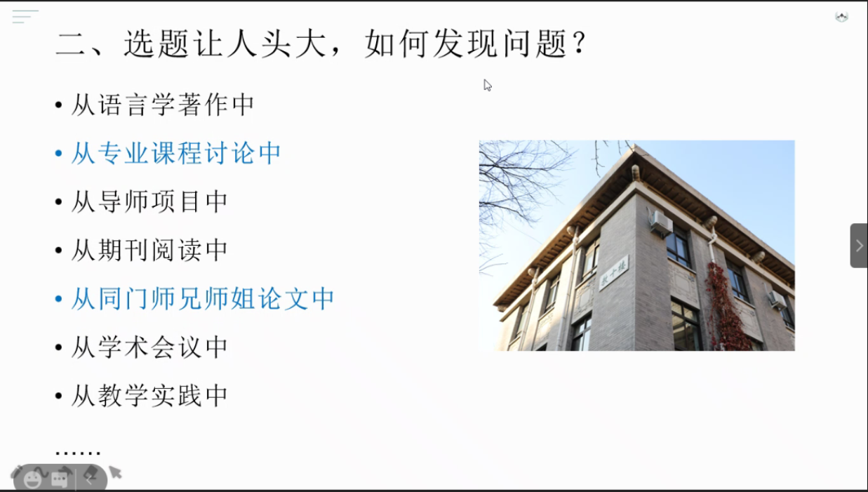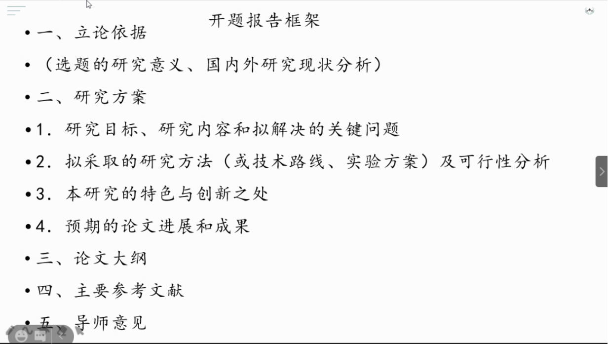 为弘扬创新严谨的学术品格、开拓进取的学术精神,引导同学们学会发现问题、探究问题、解决问题,公司于2020年12月19日19:00特邀请汉语文化公司三位优秀的师兄师姐,通过开题报告撰写经验分享会的形式,借助腾讯会议,给院内一二年级同学及广大校外同学分享他们的研学心得。