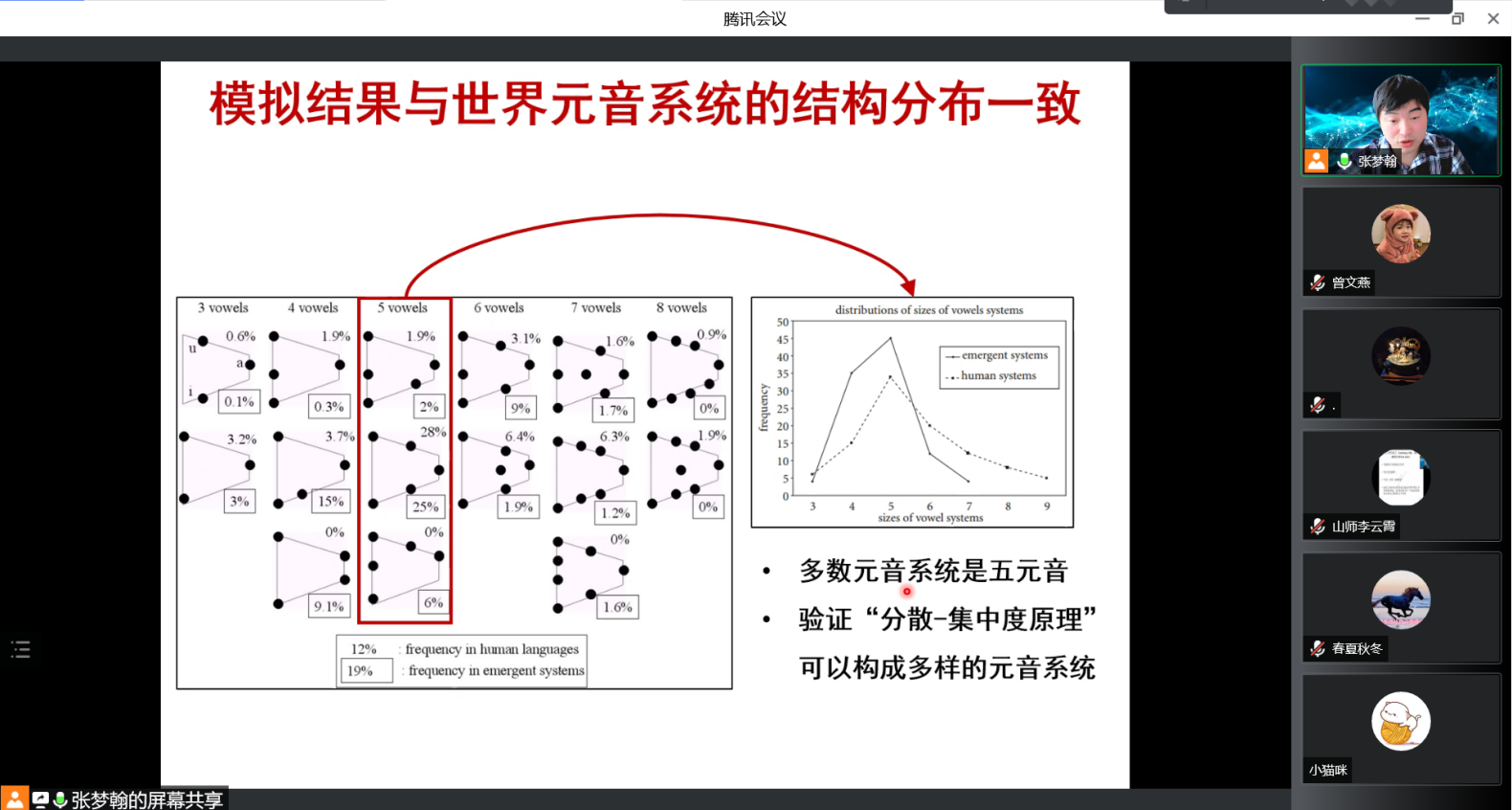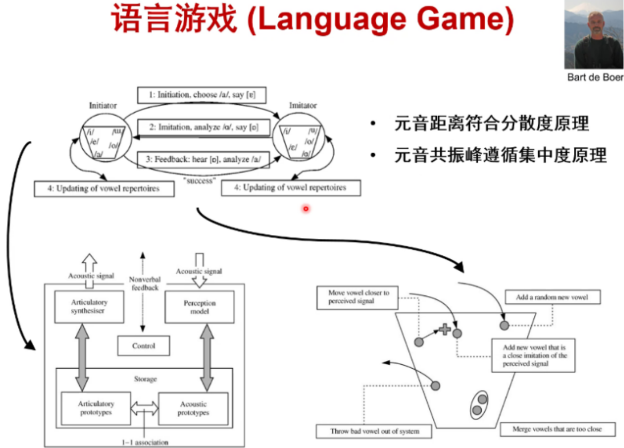 在计算机模拟仿真中,围绕元音系统的模拟仿真,张老师重点介绍了Bart de Boer的计算模拟方案——“语言游戏(Language Game)”,实验显示,模拟结果与世界元音系统的结构分布一致,多数元音系统是五元音,成功验证了“分散-集中度原理”可以构成真实环境下多样的元音系统。