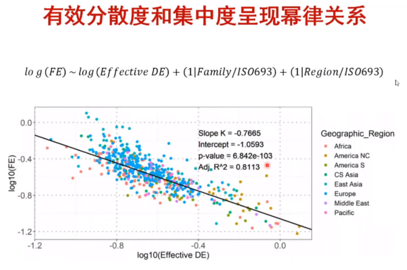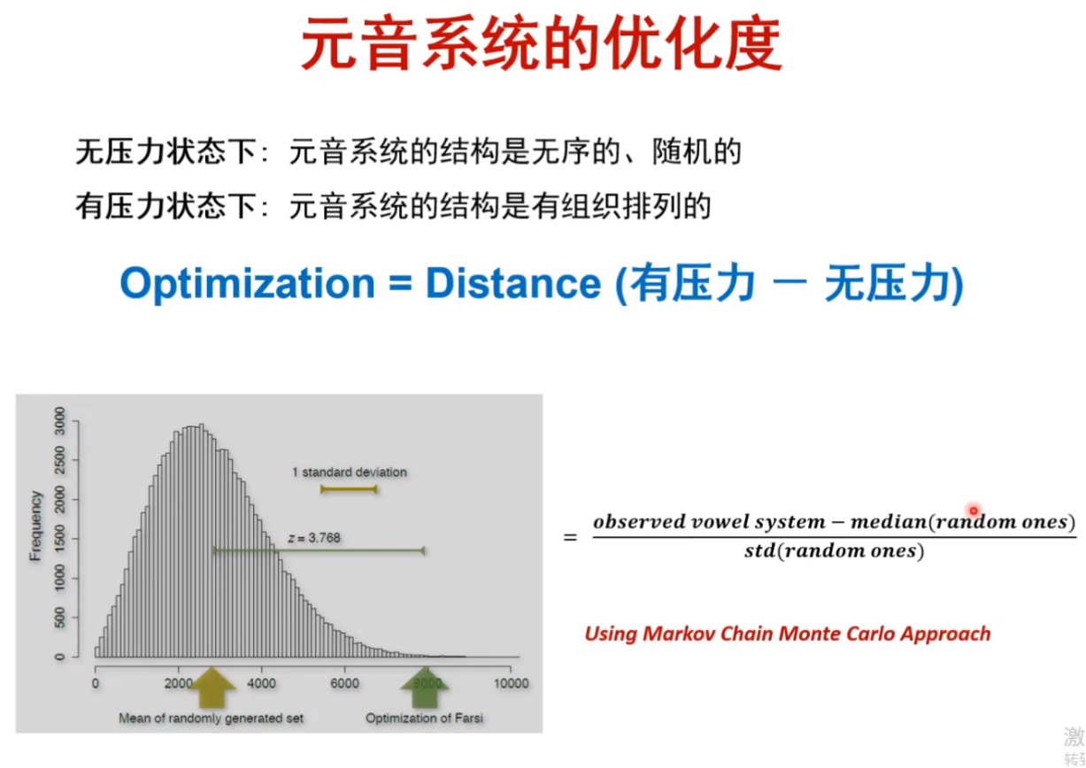 随后,张老师指出了从模拟仿真计算转向实证数据分析的可能性和必要性,并希望采用定量的方法发现真实环境下元音系统结构的变异和优化。在这一环节,张老师详细介绍了自己曾经研究工作中遇到的问题和思考。为了排除个体因素干扰、区分元音系统的个体差异和结构差异,他对“元音空间”进行了标准化操作,在此基础上,提出了“有效分散度和集中度”,并发现:在共时层面,在不同的语系和地区中,有效分散度和集中度呈现负相关关系;在历史演化层面,有效分散度和集中度两个参数之间依然呈现负相关关系,且两个结构特征的变化规律符合“选择性的、最优目标进化”特点的依存关系,这启示我们:元音系统结构的变化其实是“有目标性”的改变,是在朝着某个“最优目标”的方向发生演变。