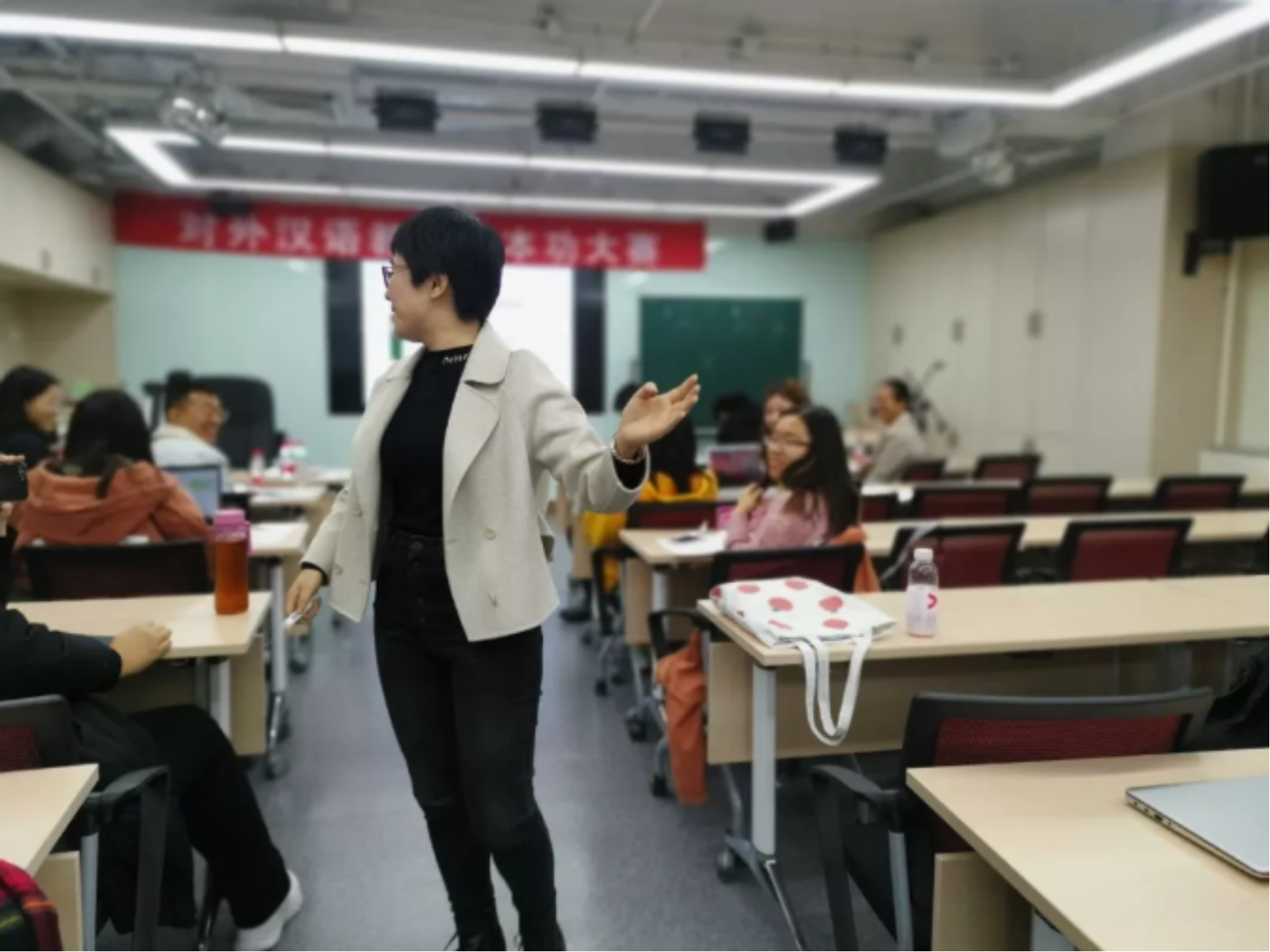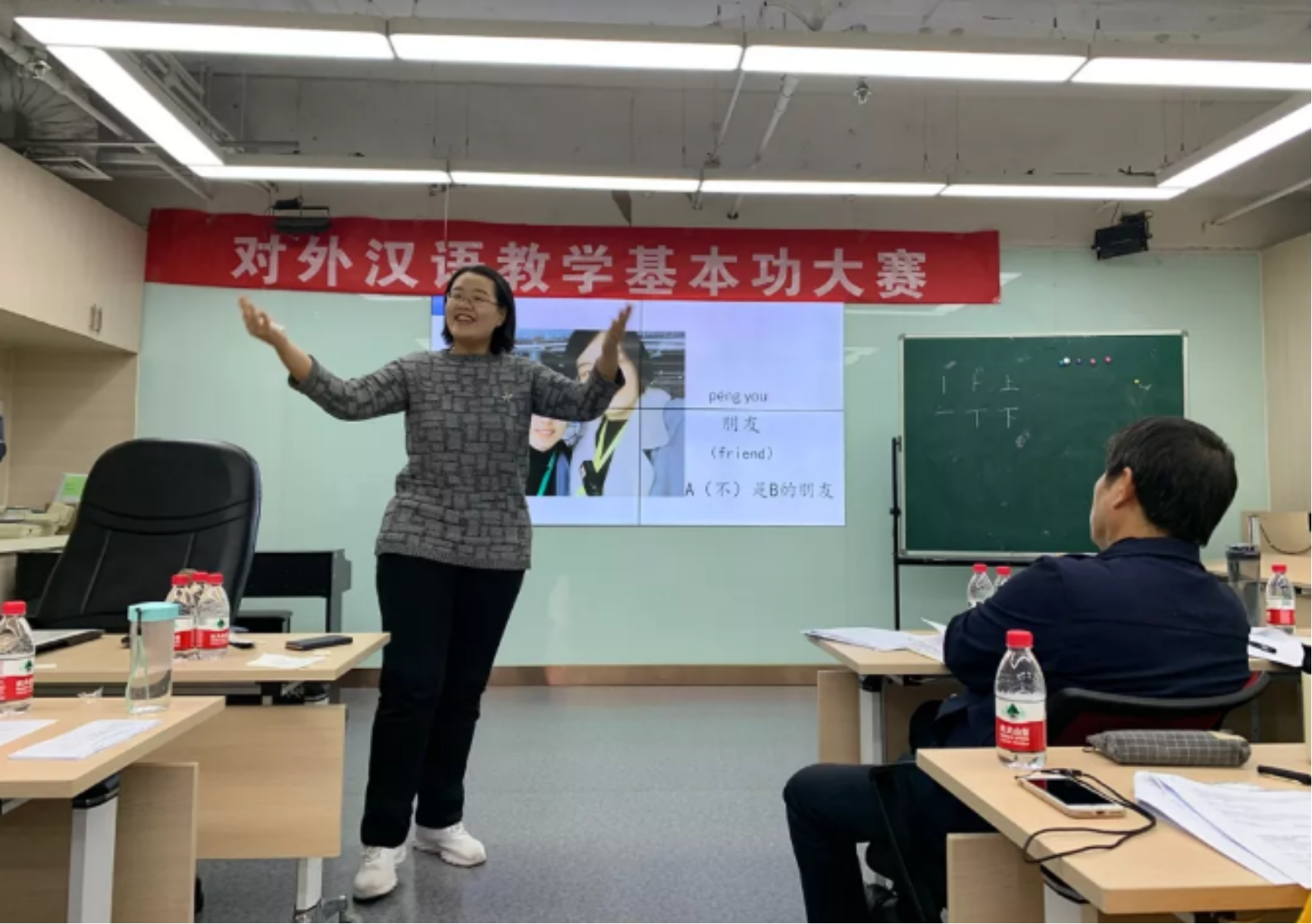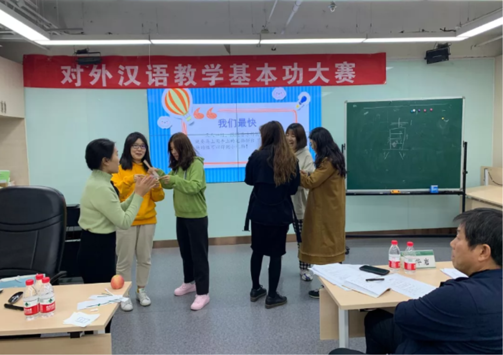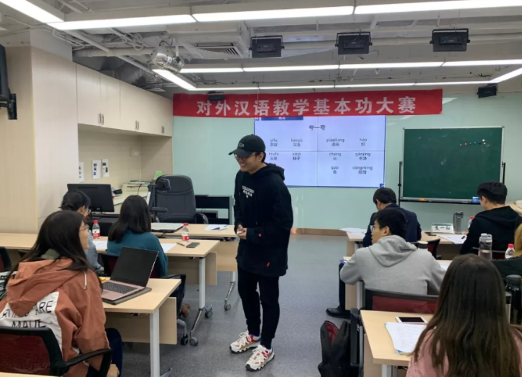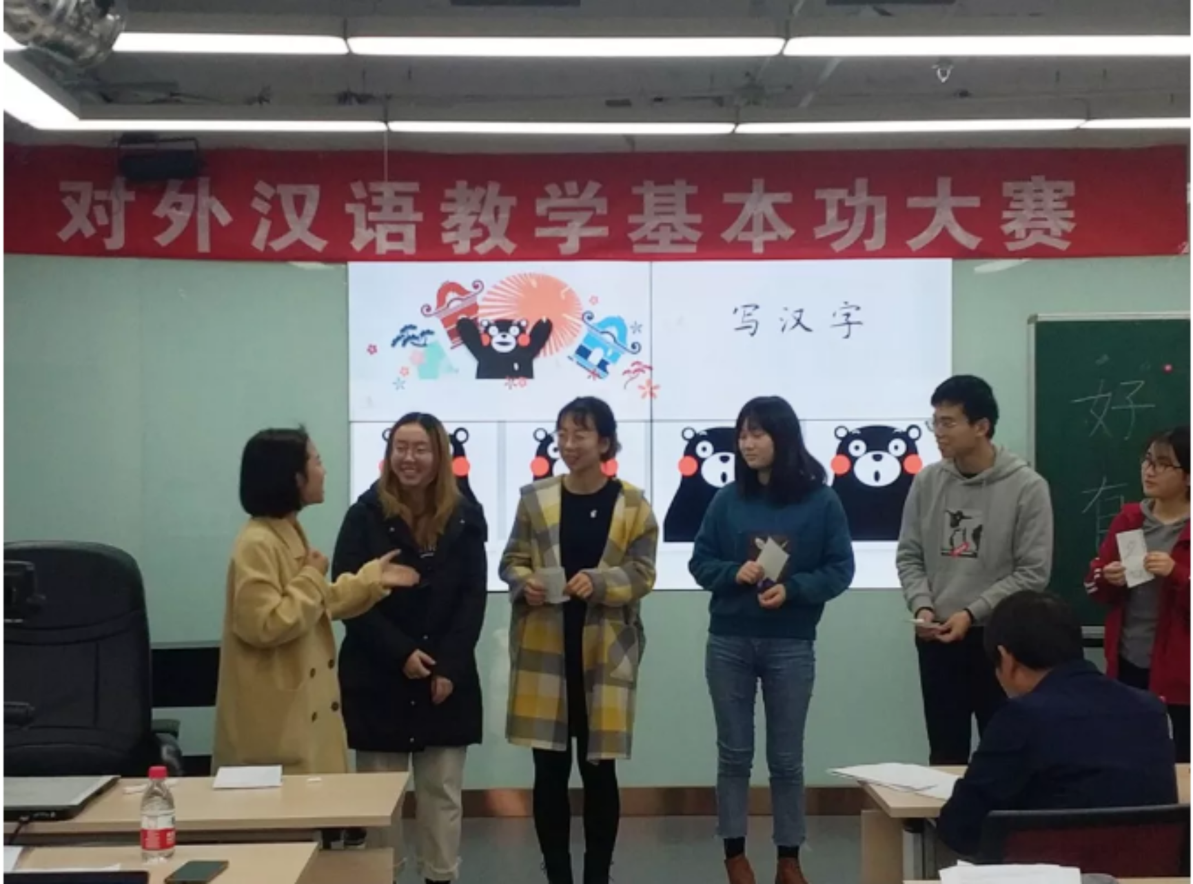 汉语文化院的卢华岩、焦一和、柯航三位老师担任了本轮决赛的评委,根据同学的现场表现以及教案、创意,做出综合点评,令同学们受益匪浅。卢华岩老师指出,一些同学在授课时忽视课文而将重点放在语法点上,这一处理并不妥当;焦一和老师纠正了同学们教学语言中冗杂的成分,并强调在制作课件时一定要注重细节,避免错字、拼音标注错误等低级问题;柯航老师从语法的角度,为同学们的语法教学设计提出许多实用可行的建议。