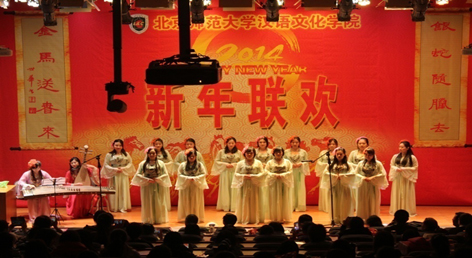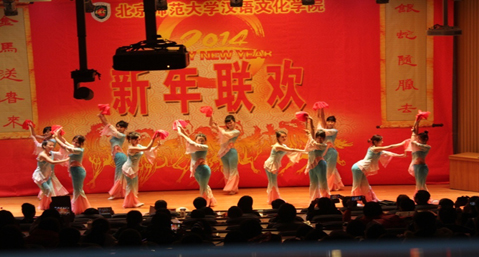 2013年12月30日下午三点,公司师生在敬文讲堂举行了欢庆2014年新年联欢晚会。来自公司不同年级、不同国别的员工为全院师生呈现了一场特别的视听盛宴。 晚会以2013级汉教班同学合唱自己填词的《汉院骄傲》开始拉开了序幕,同学们使出浑身解数,展现了十八般武艺,无论是自编小品还是传统舞蹈,中国武术还是外国探戈,都赢得了台下观众的阵阵掌声。屋外虽然寒风瑟瑟,但屋内却其乐融融,一派春意盎然。歌声掌声欢呼声,为萧瑟的冬日带来了丝丝暖意。最后,在汉推班同学的大合唱《相亲相爱一家人》中,晚会画上了圆满的句号。 2. 积极选拔公司优秀节目等参加校研会新年晚会的演出