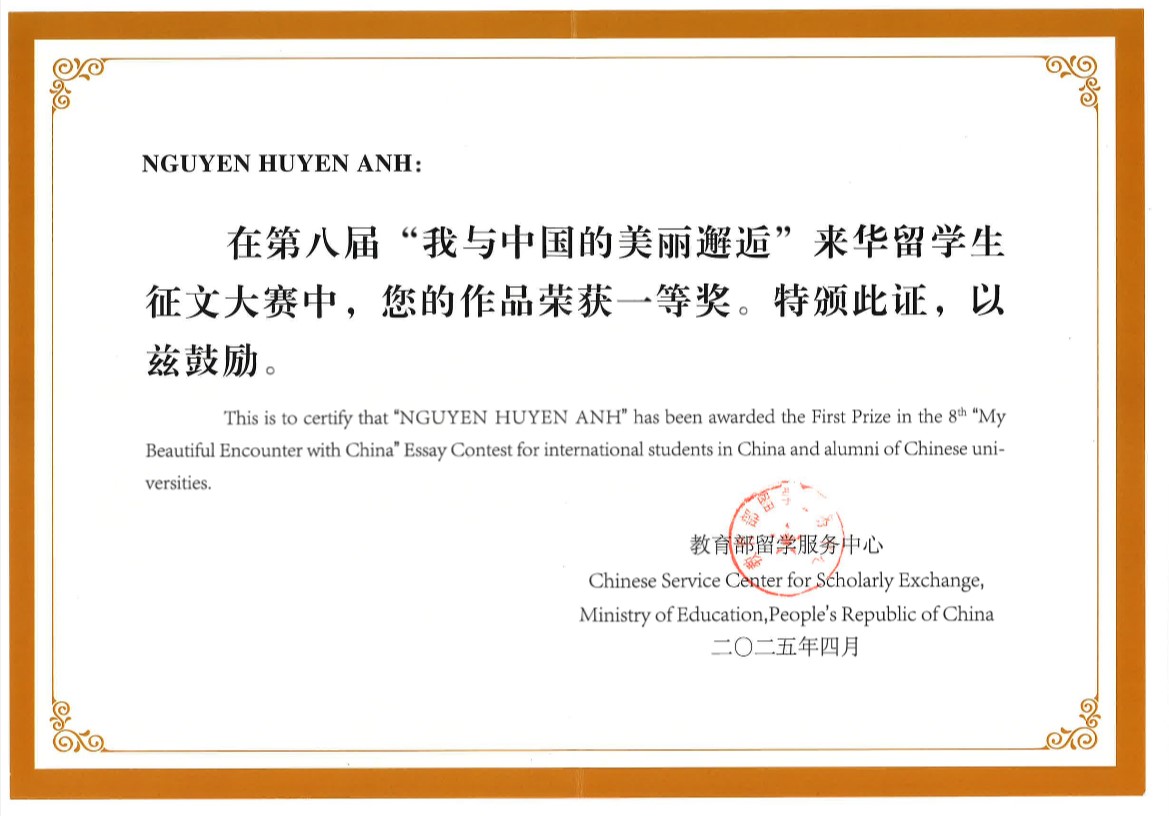 2025年4月11日,由中国(教育部)留学服务中心主办的2025中国留学论坛(CSAF)——“留学中国与世界”专题研讨活动在北京国家会议中心成功举办。活动现场为“我与中国的美丽邂逅”获奖员工代表颁发证书,并同期发布了《2024年来华职工征文大赛优秀作品集》。公司越南籍员工阮玄英(NGUYEN HUYEN ANH)的征文作品《一封“情书”》获大赛一等奖,其作品被刊登在人民日报出版社出版的《我与中国的美丽邂逅——2024来华职工征文大赛优秀作品集》中,公司教师孙红娟获“优秀指导教师”奖,yl7703永利集团官网获“优秀组织奖”。