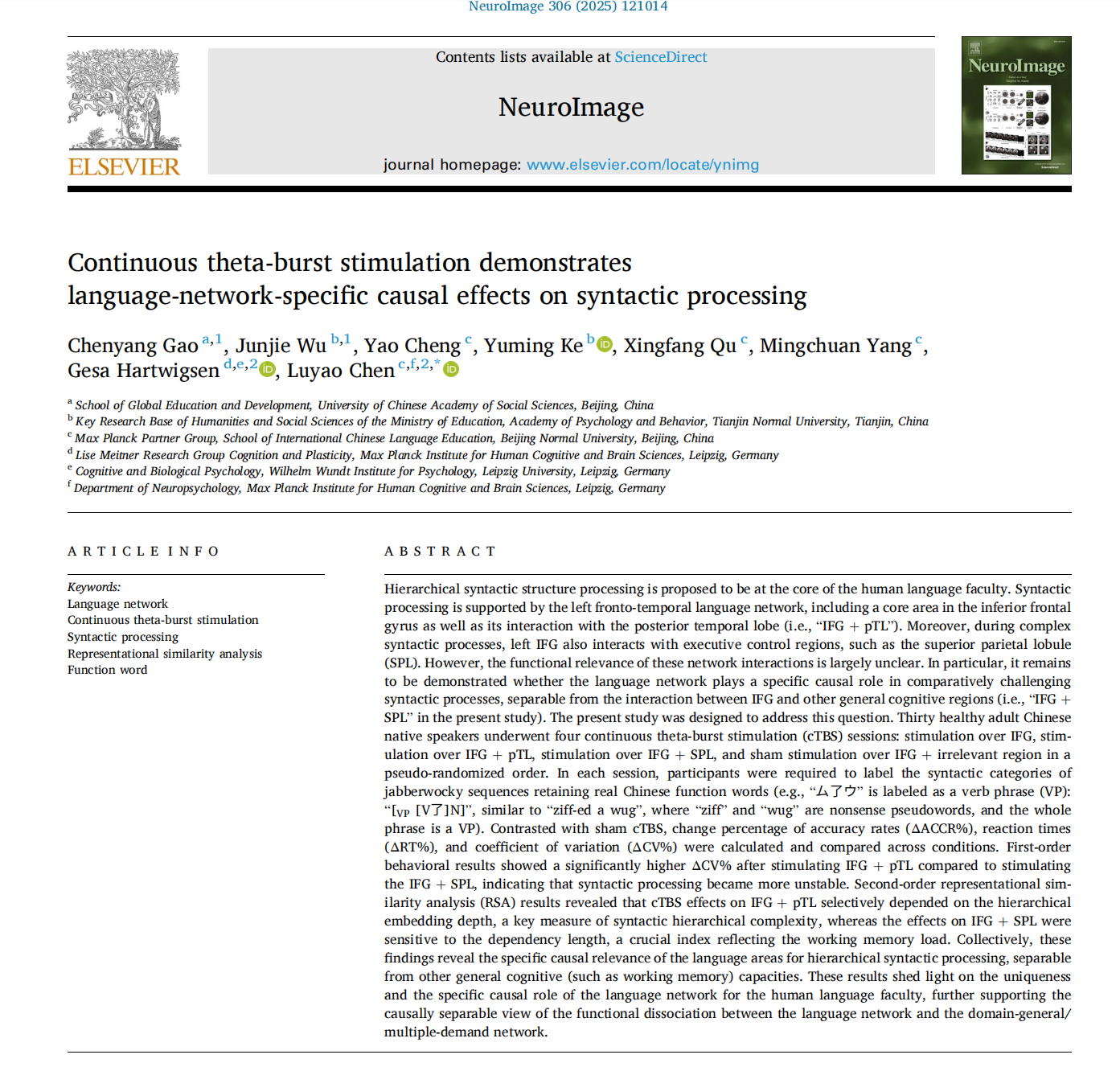 成果速递丨陈路遥:连续Theta爆发式经颅磁刺激首次揭示句法...